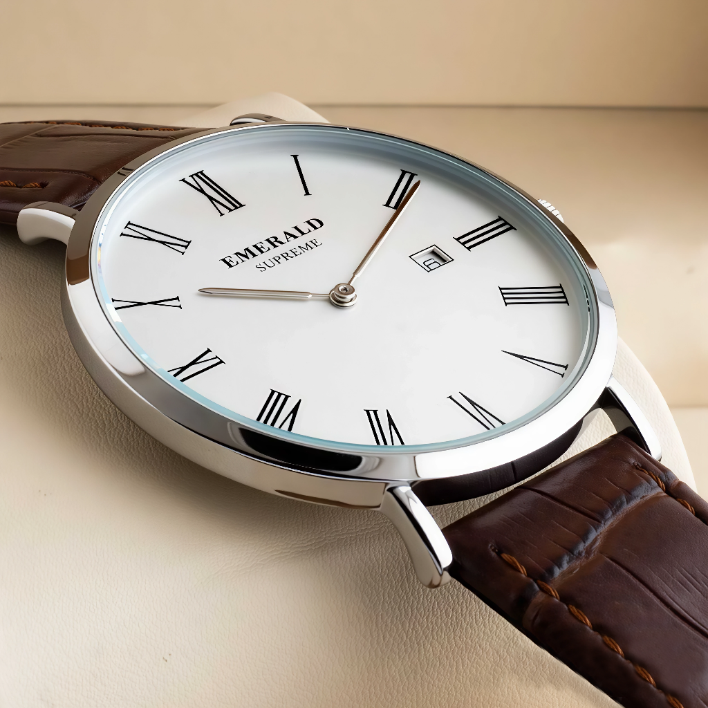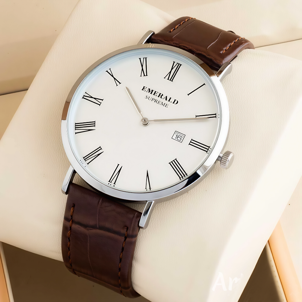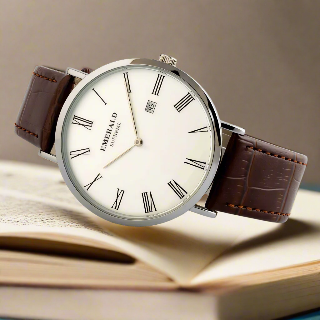 The Classic Emerald is the perfect timepiece for men who value timeless elegance. Featuring a sleek stainless-steel case, white dial with Roman numerals, and a premium brown leather strap, this watch adds sophistication to any outfit. Its minimalist design is complemented with a practical date display, making it ideal for both formal occasions and everyday wear. Powered by reliable quartz movement, this watch combines classic charm with modern functionality