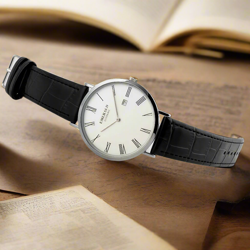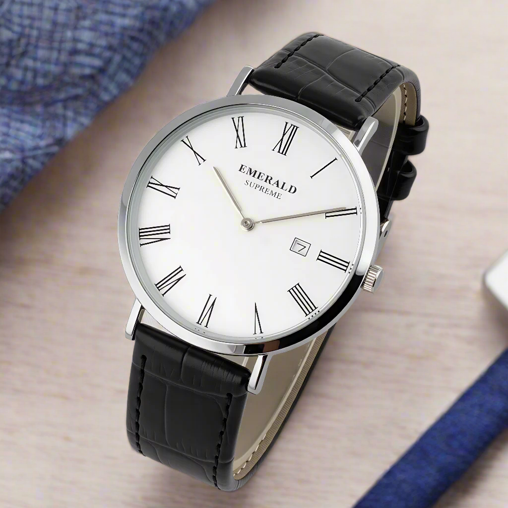The Classic Dream Emerald is the perfect timepiece for men who value timeless elegance. Featuring a sleek stainless-steel case, white dial with Roman numerals, and a premium black leather strap, this watch adds sophistication to any outfit. Its minimalist design is complemented with a practical date display, making it ideal for both formal occasions and everyday wear. Powered by reliable quartz movement, this watch combines classic charm with modern functionality