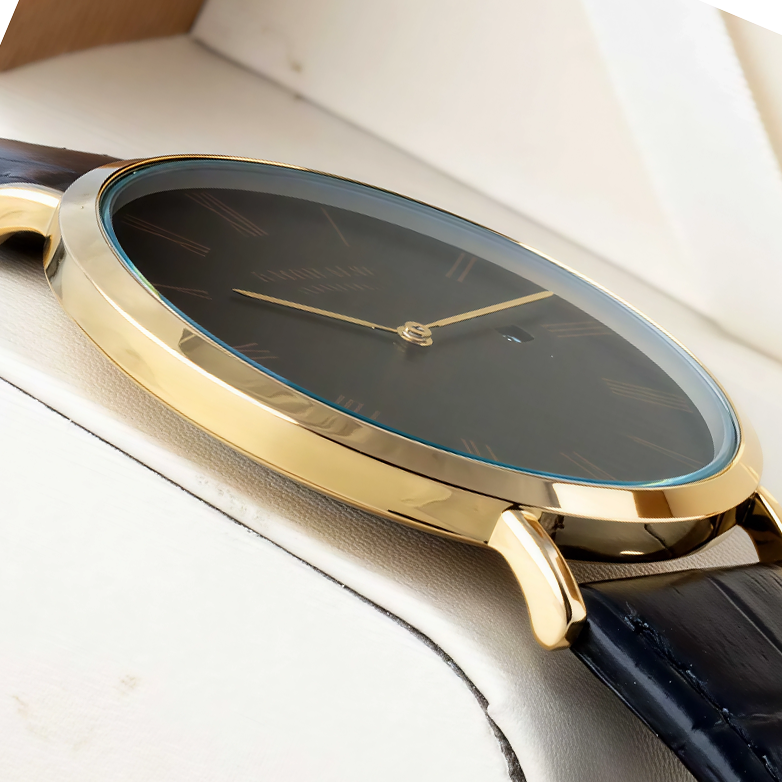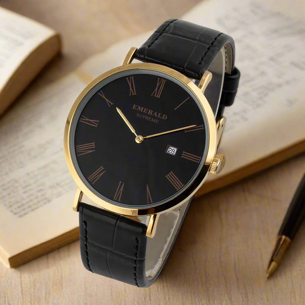 The Classic Dream Emerald is the perfect timepiece for men who value timeless elegance. Featuring a sleek yellow gold stainless-steel case, black dial with Roman numerals, and a premium black leather strap, this watch adds sophistication to any outfit. Its minimalist design is complemented with a practical date display, making it ideal for both formal occasions and everyday wear. Powered by reliable quartz movement, this watch combines classic charm with modern functionality