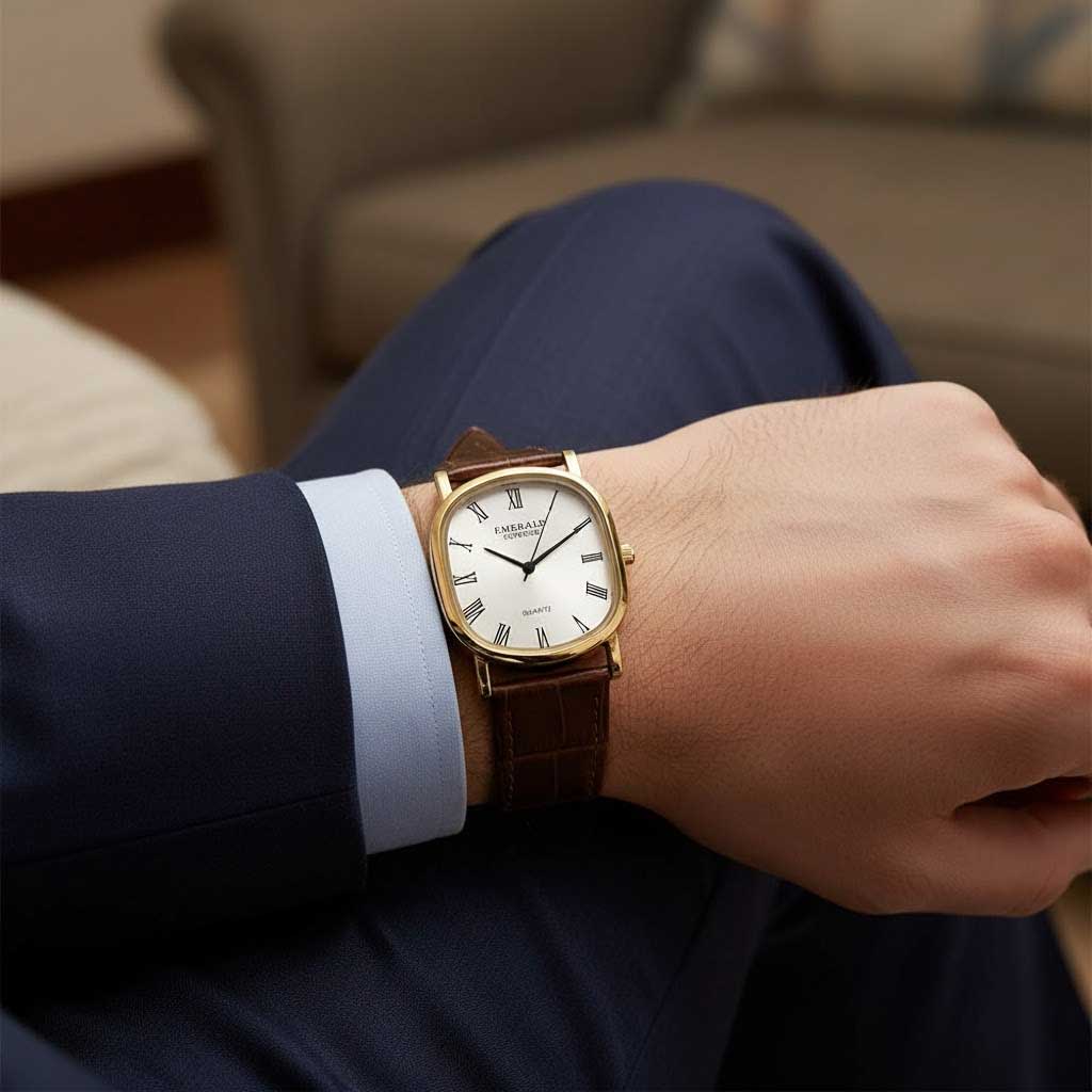 Timeless elegance meets precision — the Emerald Ellipse-watch features a sleek Ellipse case, Roman numeral dial, and classic leather strap. Powered by a reliable quartz movement, it embodies luxury, heritage, and sophistication for the modern gentleman.