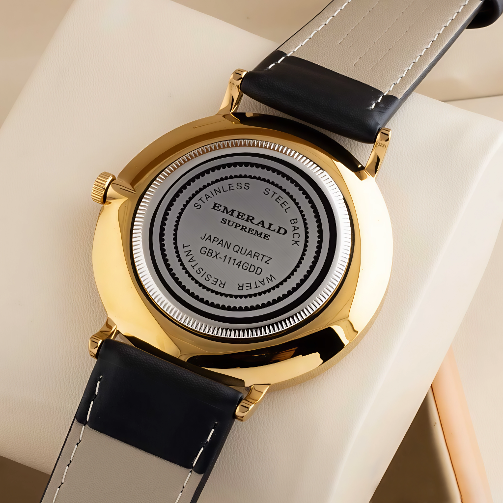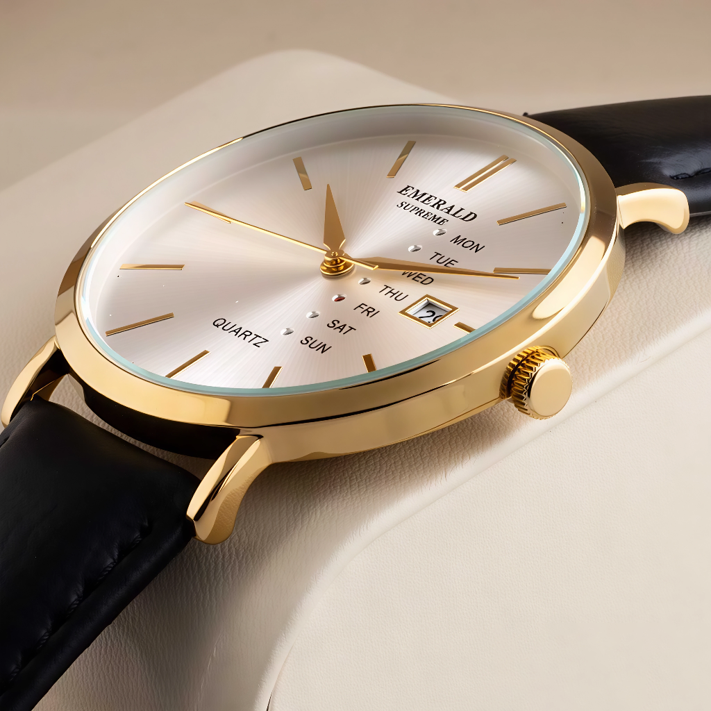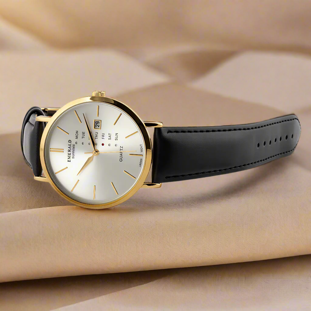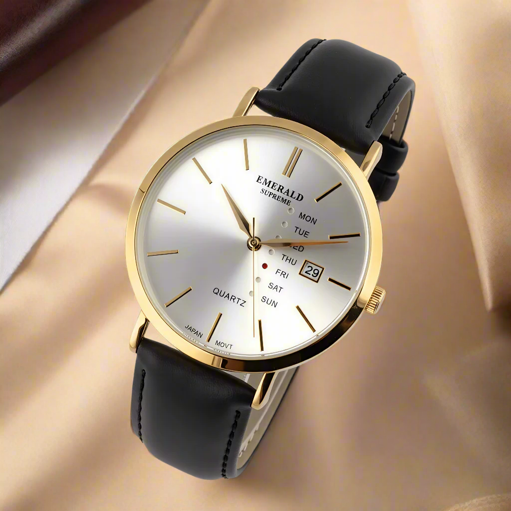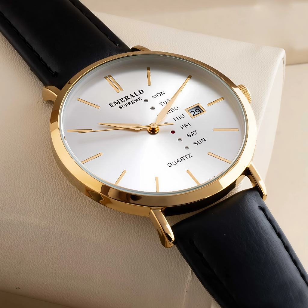 A perfect blend of elegance and functionality, the Emerald Supreme features a sleek golden case paired with a premium black leather strap for a timeless look. Its minimalist white dial showcases fine golden hour markers, along with day and date display windows for everyday convenience. Powered by precise Japanese quartz movement, this watch ensures reliability and style in every moment. Whether for formal occasions or daily wear, the Emerald Supreme adds a touch of sophistication to your wrist.