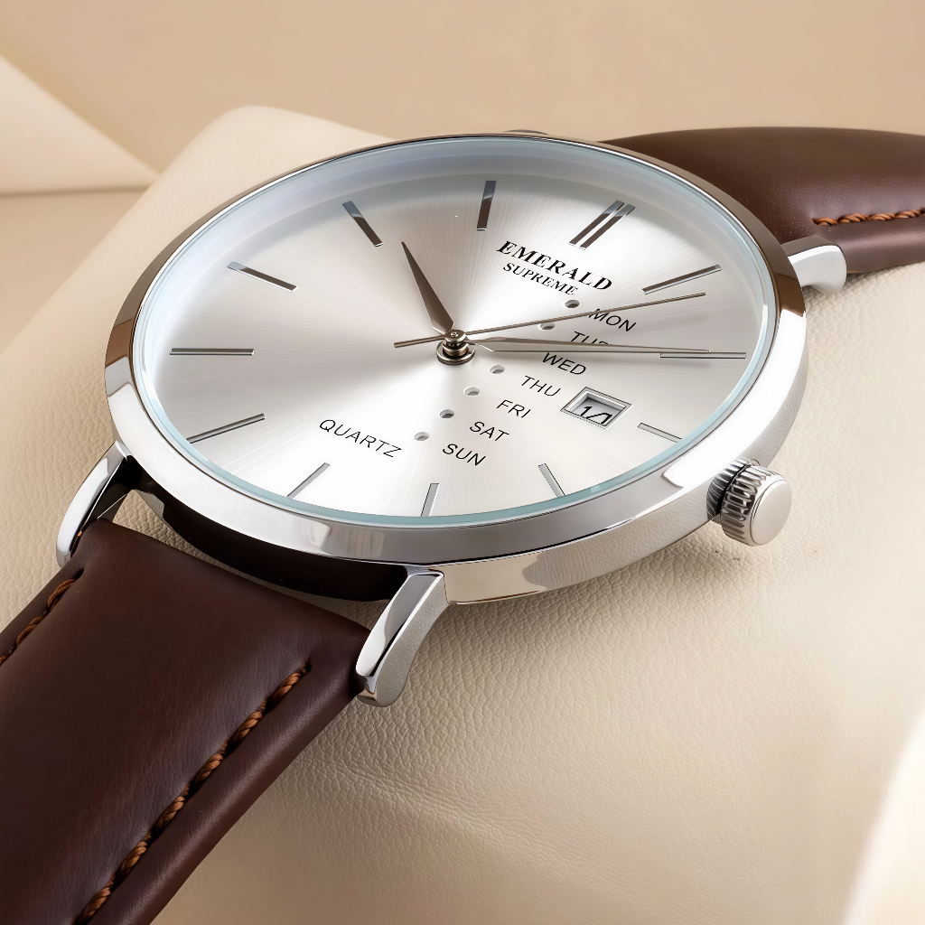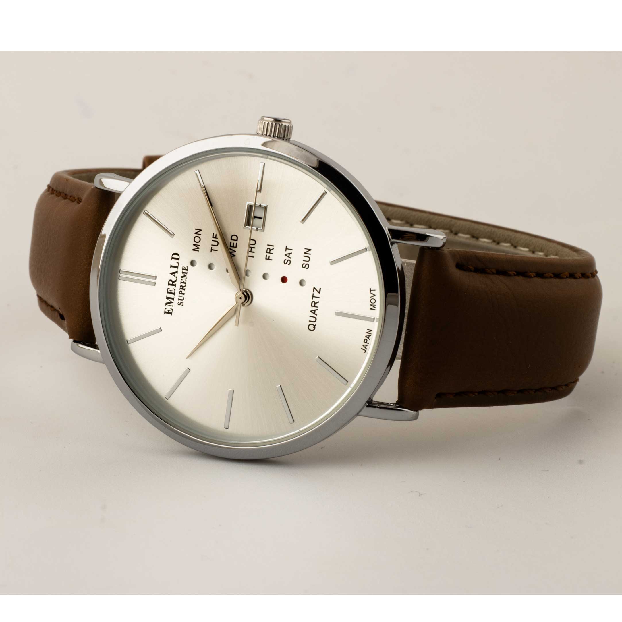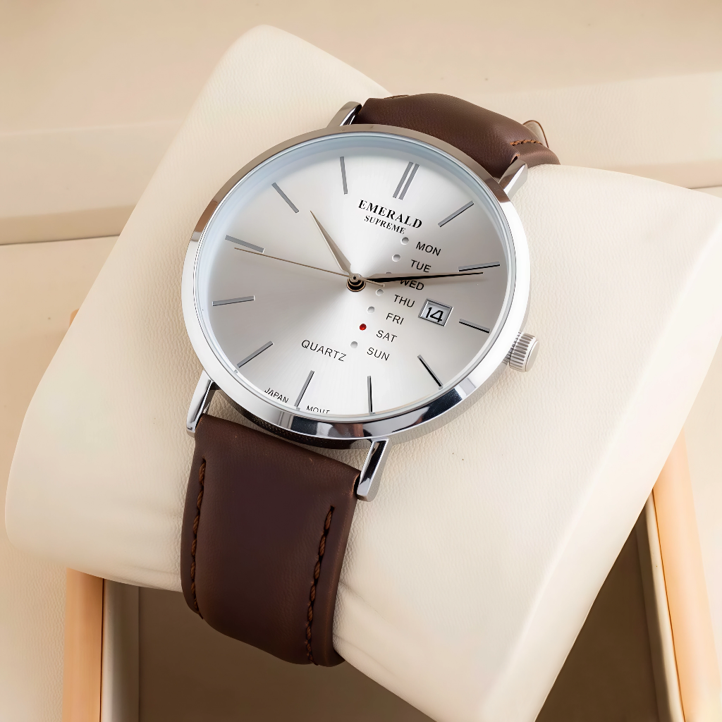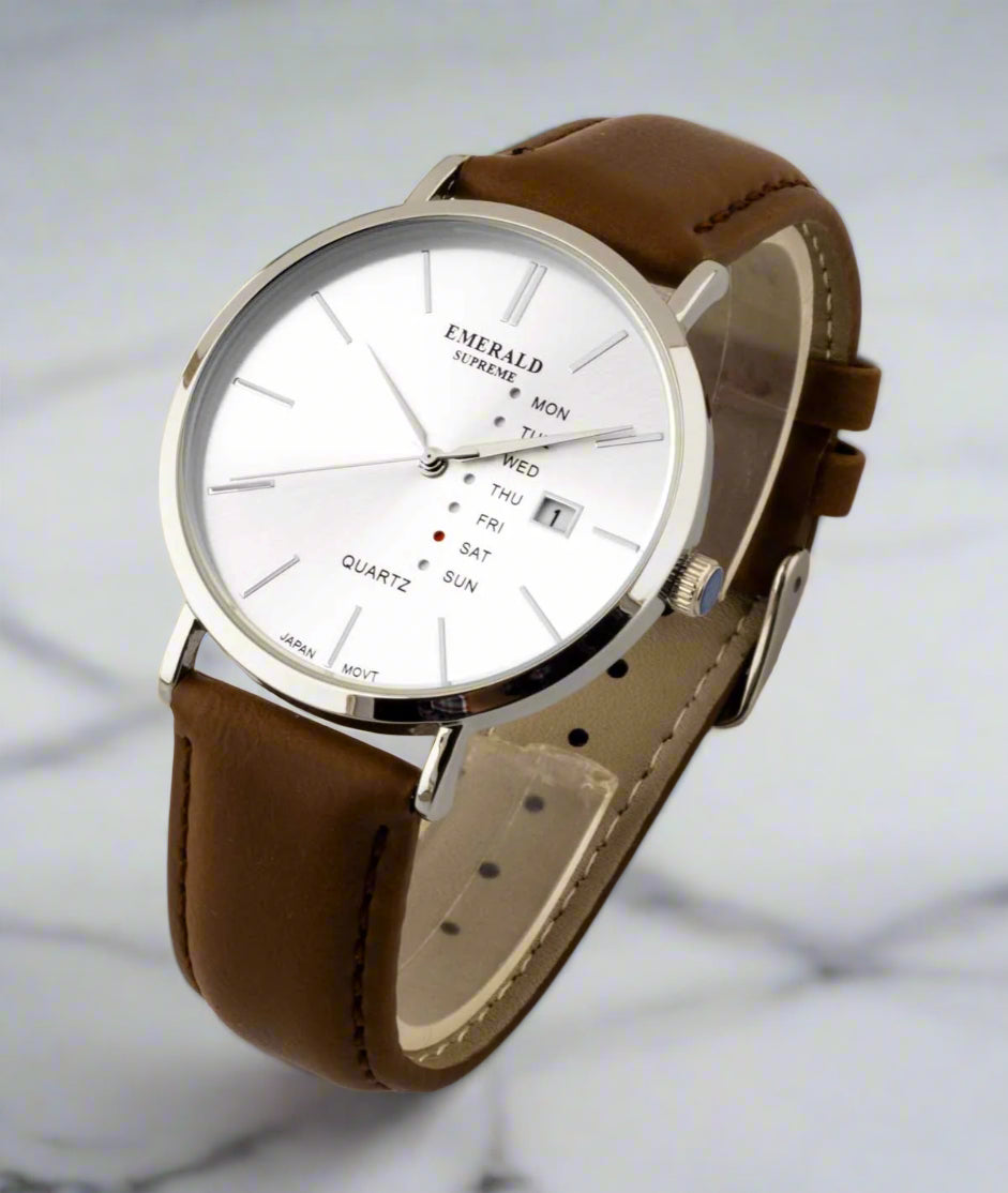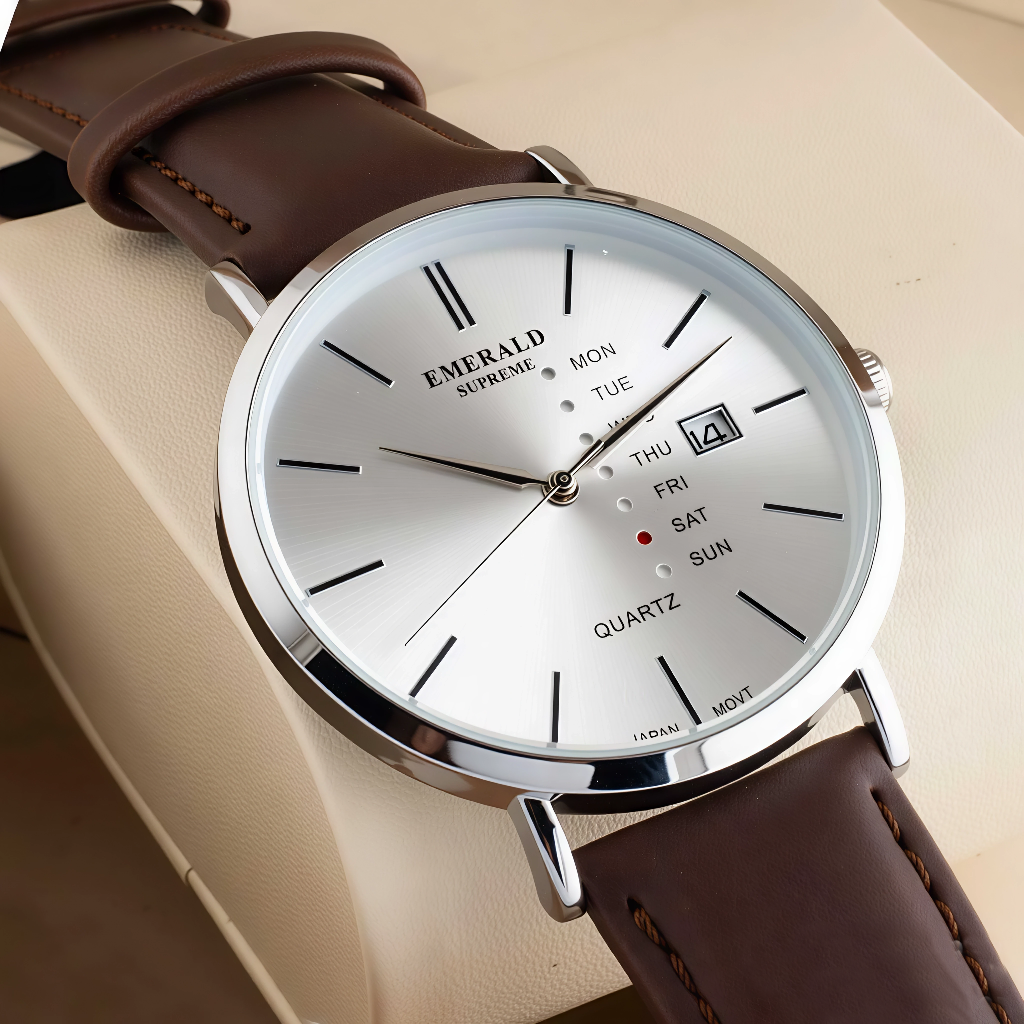 A refined 40mm Silver case paired with a rich brown leather strap. Features a bold black dial with silver markers, day & date display, and reliable Japanese Quartz Movement — perfect for both casual and formal wear.
