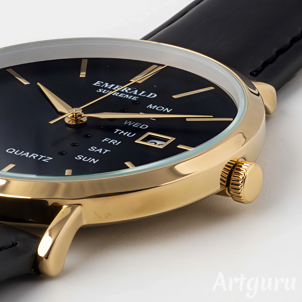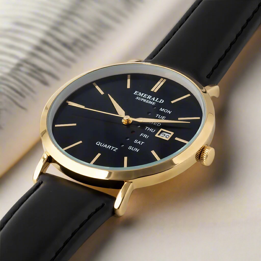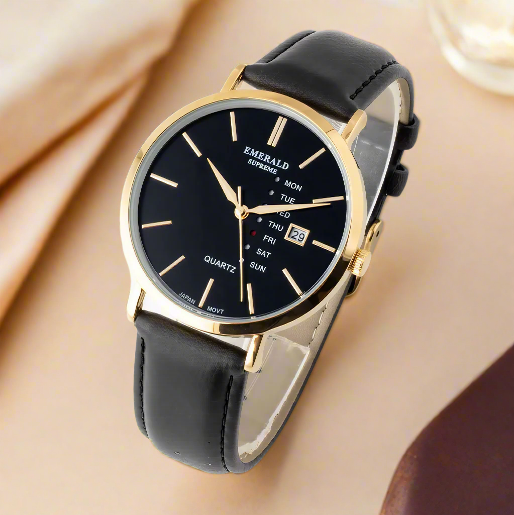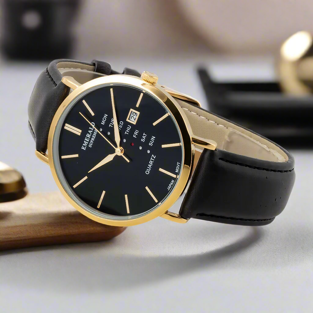A sleek 40mm gold-tone case with a premium black leather strap, paired with a bold black dial and golden hour markers. Featuring day and date display with Japanese Quartz precision, this watch blends timeless elegance with modern functionality.
