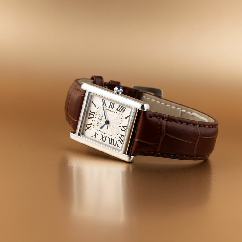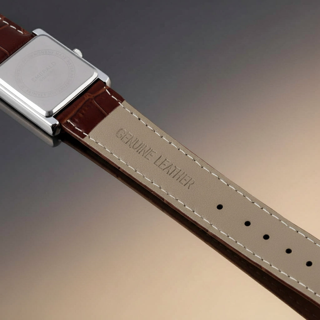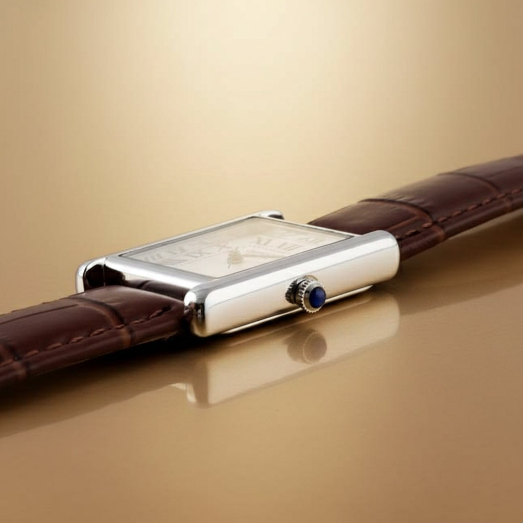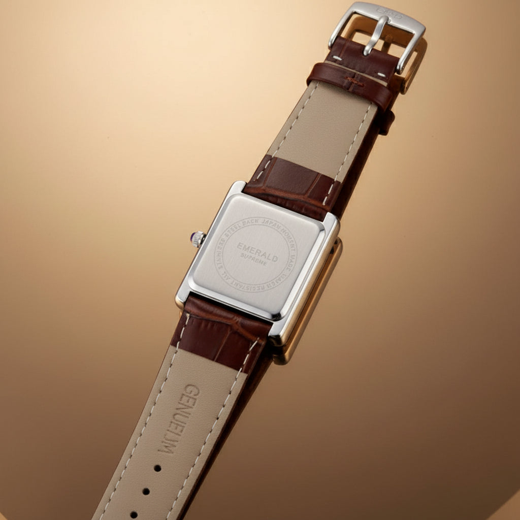 A true icon of style — the Emerald Tank Solo blends classic design with modern refinement. Its rectangular case, Roman numeral dial, and blue cabochon crown make it a timeless statement piece for both casual and formal wear.