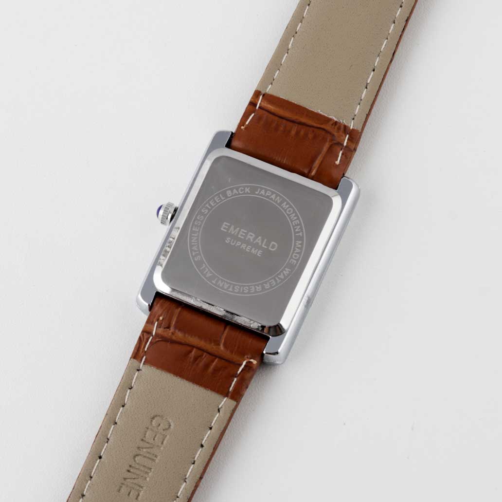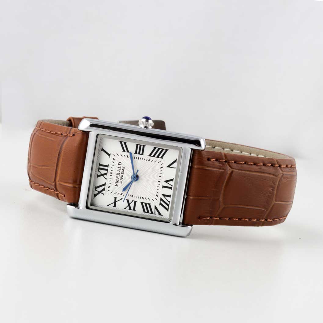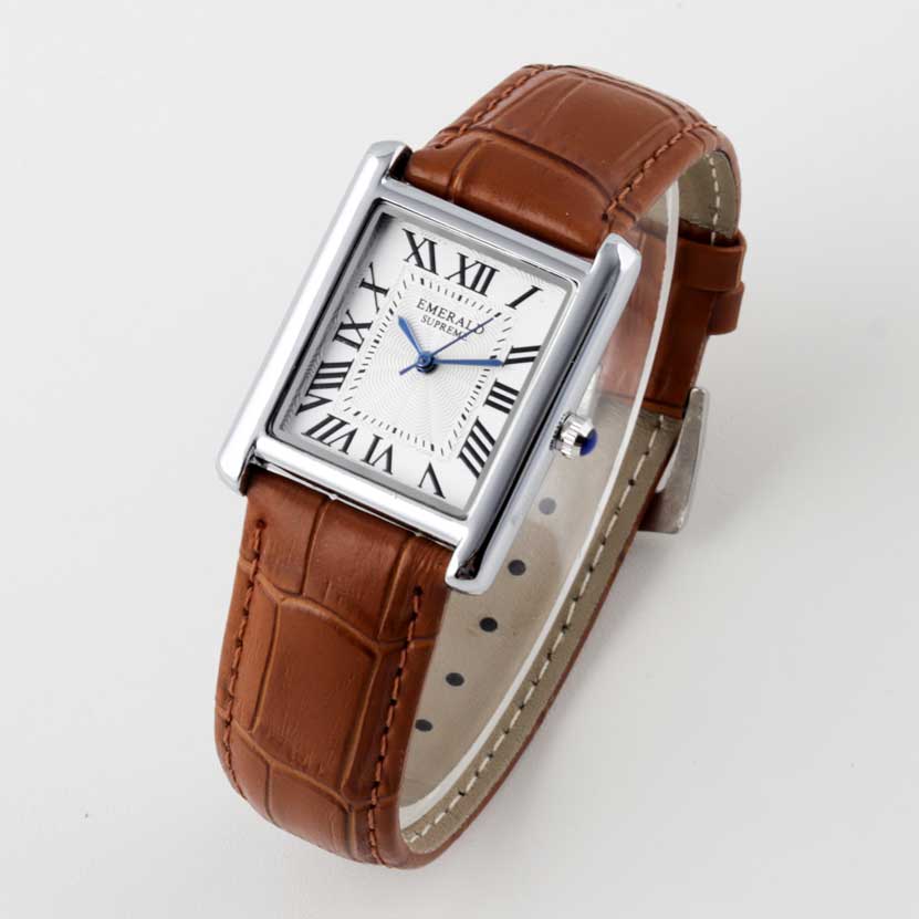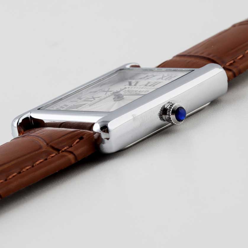 A true icon of style — the Emerald Tank Solo blends classic design with modern refinement. Its rectangular case, Roman numeral dial, and blue cabochon crown make it a timeless statement piece for both casual and formal wear.